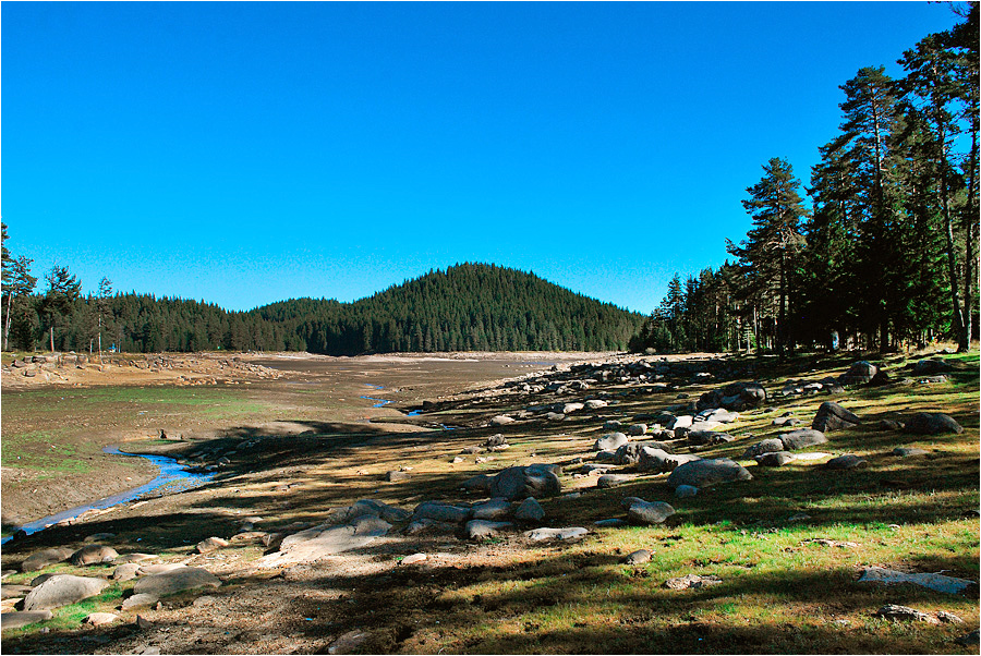 Стигам до стената на язовира, а оградата продължава да ме дразни и решавам да се върна и да продължа разходката си край язовир Широка поляна с надеждата след есенните дъждове да се е понапълнил. Напротив. Беше се превърнал в истинска поляна от която идеше мирис на тиня, а малка рекичка лъкатушеше по дъното му.